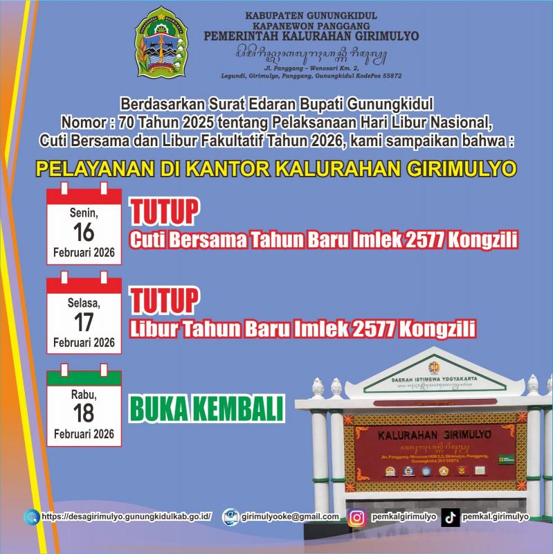 Girimulyo sida Jumat 13 Februari 2026 . Info untuk cuti dan libur tgl 16 dan 17 Februari 2026.Pelayanan kalurahan Girimulyo buka kembali Rabu 18 Februari 2026.