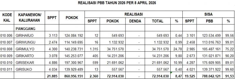 Girimulyo sida Kamis 9 April 2026 Hari ini koordinator PBB Girimulyo Bapak Heri Wibowo dan 2 orang dukuh yaitu Dukuh Macanmati Bapak Margiyono dan Dukuh Tanggung Bapak Geseng Priyanta mengikuti rakor PBB di RR Kapanewon Panggang bersama Koordinator PBB dan perwakilan Dukuh se Kapanewon Panggang. Acara diselenggarakan oleh Kapanewon Panggang Bapak Kelik Sutarto SIP. Dalam rakor dibahas progres penarikan pajak dan capaian SD April 2026 minggu I. Untuk Girimulyo capaian sudah 25℅ yang masuk dan telah disetor ke BKAD.